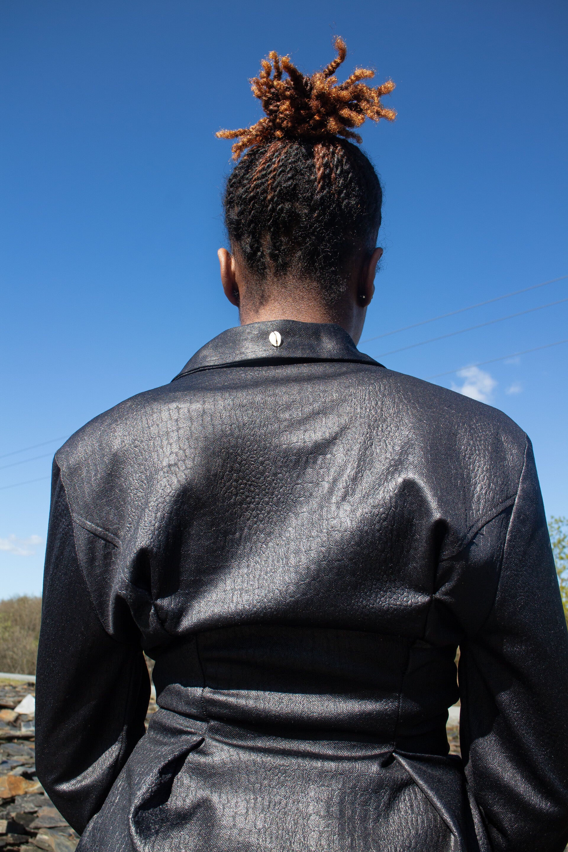 Blazer femme cintré, tissu motif peau de crocodile avec charms cauris